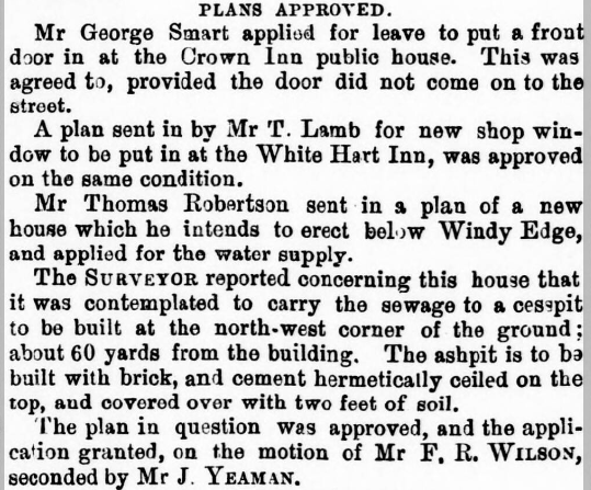 Mr George Smart applisd for leave to put a front door in at the Crown Inn public house. This was agreed to, provided the door did not come on to the street. A plan sent in by Mr 'T. Lamb for new shop win- dow to be put in at the White Hart Inn, was approved on the same condition. Mr Thomas Robertson sent in 9 plan of a new house which he intends to erect below Windy Edge, and applied for the water supply. The Suaveyor reported concerning this house that it was contemplated to carry the sewage to a cesspit: to be built at the north-west corner of the ground; about 60 yards from the building. The ashpit is to ba built with brick, and cement hermetically ceiled on the top, aud covered over with two feet of soil. ‘The plan in question was approved, and the appli- cation granted, on the motion of Mr F, R. Witsoy, seconded by Mr J. YEAMAN.