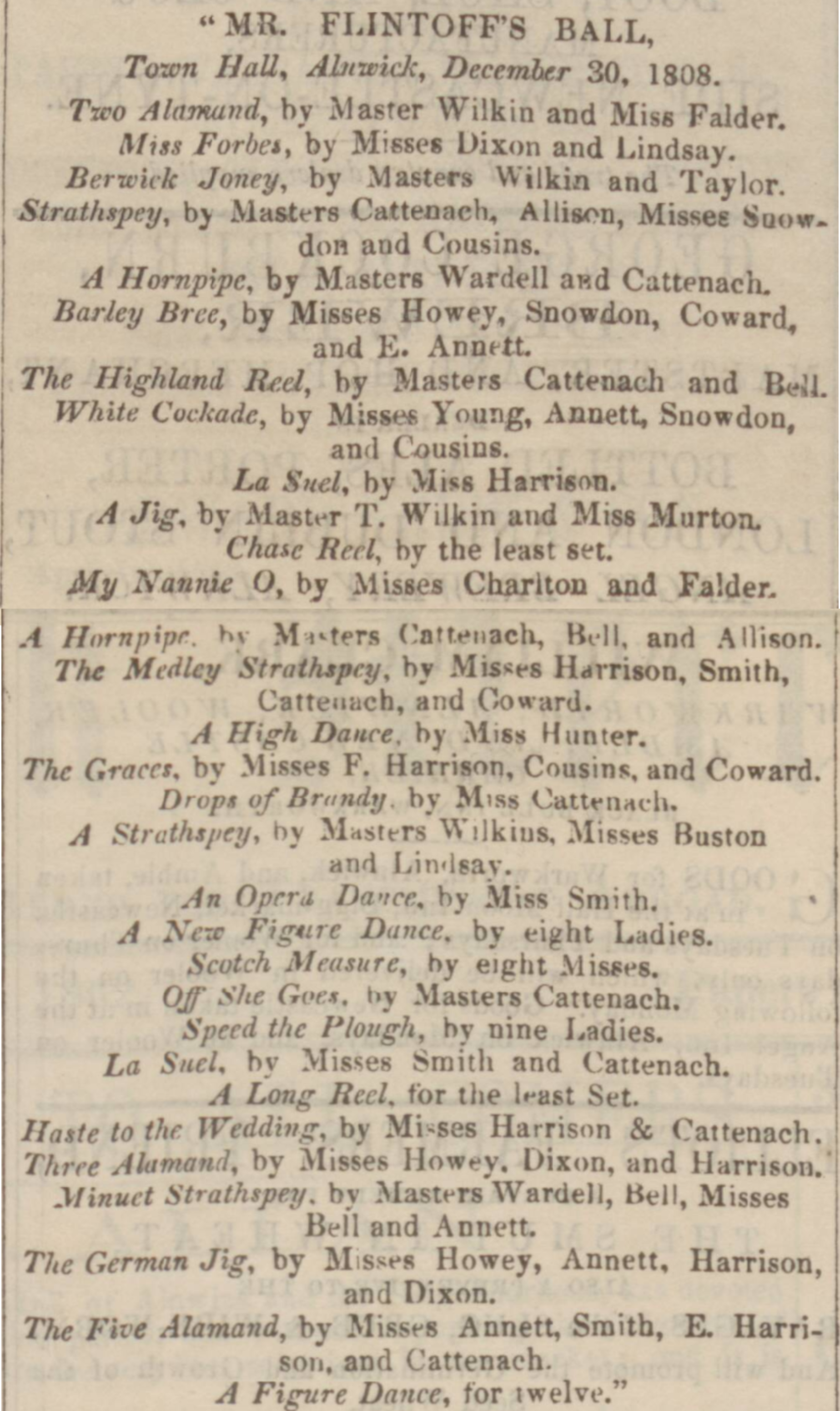 MR. FLINTOFF’s BALL, Town Hall, Alnwick, December 30, 1808. Two Alamand, by Master Wilkin and Miss Falder, Miss Forbes, by Misses Dixon and Lindsay. Berwick Joney, by Masters Wilkin and Taylor. Strathspey, by Masters Cattenach, Allison, Misses | don and Cousins, A Hornpipe, by Masters Wardell and Cattenach, Barley Bree, by Misses Howey, Snowdon, Coward, a The Highland Reel, by Masters Cattenach and Bell, White Cockade, by Misses Young, Annett, Snowdon, and Cousins. La Suel, by Miss Harrison. A Jig, by Master T, Wilkin and Miss Murton, Chase Reel, by the least set. My Nannie O, by Misses Chariton and Falder A Hornpipe. by Masters Cattenach, Bell, and Allison. The Medley Strathspey, by Misses Harrison, Smith, Catteuach, and Coward. A High Dance, by Miss Hunter. The Graces, by Misses F, Harrison, Cousins, and Coward. Drops of Brandy, by Miss Cattenach, A Strathspey, by Masters Wilkins, Misses Buston and Lindsay. An Opera Dance, by Miss Smith. . A New Figure Dance, by eight Ladies. Scotch Measure, by eight Misses, Off She Goes, by Masters Cattenach, Speed the Plough, by nine Ladies. La Suel, by Misses Smith and Cattenach. A Long Reel, tor the least Set. Haste to the Wedding, by Misses Harrison & Cattenach. Three Alamand, by Misses Howey, Dixon, and Harrison, Minuet Strathspey. by Masters Wardell, Bell, Misses Bell and Annett. The German Jig, by Misses Howey, Annett, Harrison, and Dixon. The Five Alamand, by Misses Annett, Smith, E. Harri- son, and Cattenach. A Figure Dance, for wwelve.