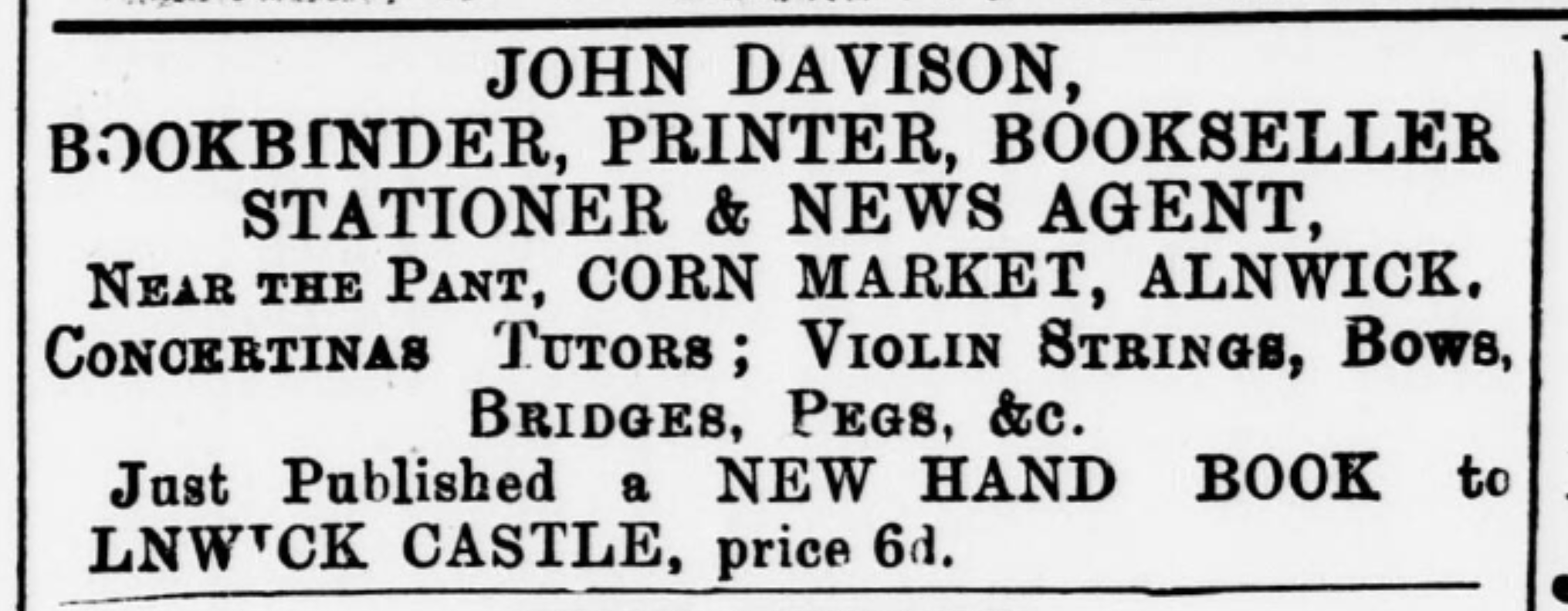 JOHN DAVISONBOOKBINDER, PRINTER, BOOKSELLERSTATIONER & NEWS AGENT,Near the pant, CORN MARKET, ALNWICK.Concertinas Tutors; Violin Strings, Bows,Bridges, Pegs, &c.Just Published a NEW HAND BOOK to ALNWICK CASTLE, price 6d.