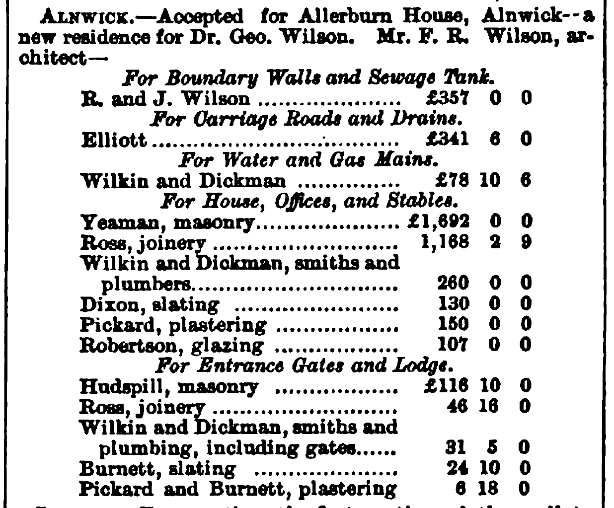 Accepted for Allerburn House, Alnwick - a new residence for Dr. Geo. Wilson. Mr. F. R. Wilson, architect.