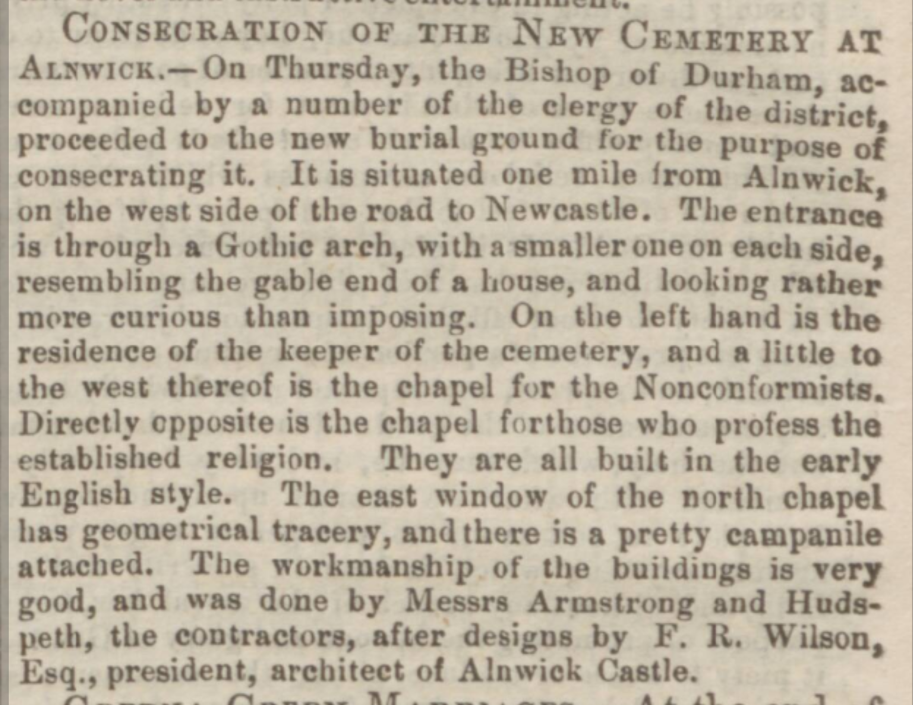 On Thursday, the Bishop of Durham, accompanied by a number of the clergy of the district, proceeded to the new burial ground for the purpose of consecrating it. It is situated one mile from Alnwick, on the west side of the road to Newcastle. The entrance is through a Gothic arch, with a smaller one on each side, resembling the gable end of a house, and looking rather more curious than imposing. On the left hand is the residence of the keeper of the cemetery, and a little to the west thereof is the chapel for the Nonconformists, Directly opposite is the chapel for those who profess the established religion, They are all built in the early English style. The east window of the north chapel has geometrical tracery, and there is a pretty campanile attached. The workmanship of the buildings is very good, and was done by Messrs Armstrong and Hudspeth the contractors, after designs by F. R. Wilson Esq., president, architect of Alnwick Castle.