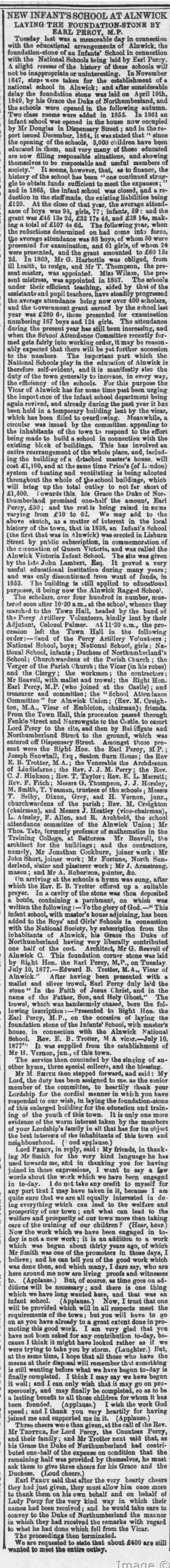 NEW INFANTS SCHOOL AT ALNWICK LAYING THE FOUNDATION-STONE BY EARL PERCY, M.P. Tuesday last was a memorable day in connection with the educational arrangements of Alnwick, the foundation-stone of an Infants' School in connection with the National Schools being laid by Earl Percy. A slight resume of the history of these schools will not be inappropriate or uninteresting. In November 1847, steps aero taken for the establishment national school in Alnwick; and after considerable delay the foundation stone was laid on April 19th, 1849, by his Grace the Duke of Northumberland, and the schools were opened in the following autumn. Two class rooms were added in 1855. In 1861 an infant school was opened in the house now occupied by Douglas in Dispensary Street; and iv the report issued December, 1864, it was stated that since the opening of the schools, 3,000 children have been educated in them, and very many of those educated are now filling responsible situations, and showing themselves to be respectable and useful members of society." It seems, however, tbat, to finance, the history of the school has been one continued struggle to obtain funds sufficient to meet the expenses; and in 1865, the infant school was closed, and reduction in the staff made, the existing liabilities being £120. At the close of that year, the average attendance of boys was 93, girls, 77; infants, 59: and the grant was £45 13s 2d, £32 17s 4d, and £28 14s, making a total of £107 4s 6d. The following year, when the reductions determined on had come into force, the average attendance was 88 boys, of whom 50 were presented for examination, and 61 girls, of whom 24 were presented, and the grant amounted to £60 15s 2d. In 1869, Mr G. Harbottle was obliged, from ill health, to resign, and Mr T. Thompson, the present master, was appointed. Misj Wilson, the present mistress, was appointed in 1867. The schools under their efficient teaching, aided by that of the assistants and pupil teachers, have steadily progressed the average attendance being now over 400 scholars, and the Government grant earned by the school last year was £280 6', these presented for examination numbering 167 boys and 124 girls. The attendance during the present year has still been increasing, and when the School Attend%nce Committee recently formed gets fairly into working order, it may be reasonably expected that there will yet further accession to the numbers- The important part which tho National Schools play in the education of Alnwick is therefore self-evident, and it is manifestly also the duty of the town generally to increase, in every way, the efficiency of the schools. For this purpose the Vicar of Alnwick has for some time past been urging the import mcc of the infant school department being again revived, and already during the past year it has been held in a temporary building lent by the vicar, which has been filled to overflowing. Meanwhile, a circular was issued by the committee, appealing to the inhabitants of the town to respond to the effort being made to build a school in connection with the existing bit ck of buildings. This has involved entire rearrangement of the whole place, and, including the building of a detached master's house, will cost £1,100, and the same time Price's (of ndon) system of heating and ventilating being adopted throughout the whole of (he school buildings, which will bring np the total outlay to not far short of £1,500. owards this, his Grace the Duke of Northumberland promised one-half the amount, Earl Percy, £50; and the rest is being raised in sums varying from jfjlO to 61. may add to the above sketch, matter of interest the local history of the town, that in 1838, Infant's School (the first that was in .Alnwick) was erected in Lisburn Street by public subscription, in commemoration of the coronation of Queen Victoria, and was called the Alnwick Victoria Infant School. The site was given by the late John Lambert, Esq. It proved a very useful educational institution during many years; and was only discontinued from want of funds, in 1853. The building is still applied to educational purposes, it being now the Alnwick Ragged School. The scholars, over four hundred in number, mustered soon after 10*30 m., at the schco , whence they marched the Town Hall, headed by the band of 9 Percy Artillery Volunteers, kindly lent by their Adjutant, Colonel Palmer. At 11*30 a.m., the procession left the Town Hall in tbe following order:—Sand of the Percy Artillery Volunteers ; National School, boys; National Schoolgirls; National School, infants ; Duchess of Northumberland's School; Churchwardens of the Parish Church ; tbe Verger of the Parish Churoh; the Vicar (in his robes) and tbe Clergy; the workmen; the contractors; Mr Reavell, with mallet and trowel; the Right Hon. Earl Percy, M.P. (who joined at the Castle); and treasurer and committee; the "School Attendance Committee" for Alnwick Union; (Rev. M. Creighton, M.A., Vioar of Embleton, chairman); friends. Prom the Town Hall, this procession passei through Fenkle Street and Narrowgate to the Castle, to escort Lord Percy to the site, and then by Bai iffgate and Northnmberland Street to the ground, which was entered off Dispensary Street. Amongst those present were the Right Hon. the Earl Percy, P.; Joseph Suowball, Esq , Seaton Burn Honse; the Rev E. B. Trotter, M,A.; tha Venerable the Arohdeacon of Liudisfarne; tho Rev. J. J. M. Perry; tbe Rev. C. J. Hinkson; Rev. T. Taylor; Rev. E. L. Marrett; Rev. P. Fitch; Messrs G. Thompson, J. J. Horsley, M. Smith, T. Yeaman, trustees of the schools ; Messrs T. Selby, Dixon, Grey, and H. Vernon, junr., churchwardens of the parish; Rev. M. Creighton (chairman), and Messrs J. Heatley (vice-chairman), L. Ainsley, E. Allen, and R. Archbold, the school attendance committee of the Alnwick Union; Mr Thos. Tat?, formerly professor of mathematics in the Training College, at Battersea Mr Reavell, the architect for the buildings; and t