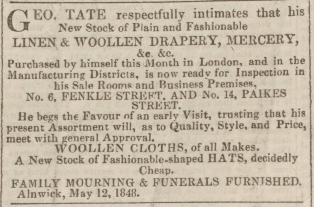 GEO TATE respectfully intimates that his New Stock of Plain and Fashionable LINEN & WOOLLEN DRAPERY, MERCERY, &c. &c.
