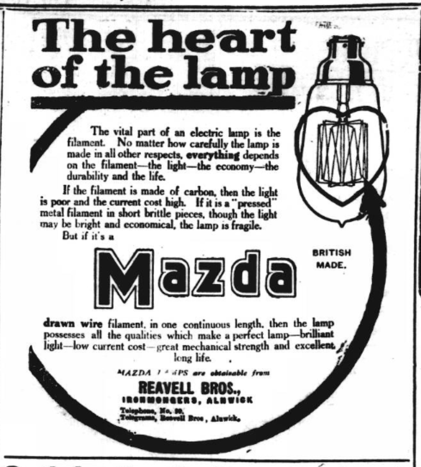But if its a Mazda British Made drawn wiire filament in one continuous length then the lamp possesses all the qualities which make a perfect lamp - brilliant light, low current cost, great mechanical strength and excellent long life. MAZDA lamps are obtainable from Reavell Bros, Ironmongers, Alnwick