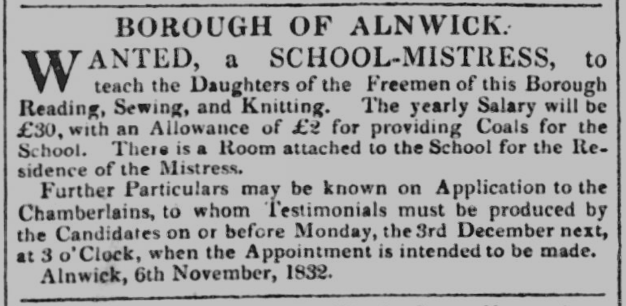 BOROUGH OF ALNWICK. WANTED, SCHOOL-MISTRESS, to teach the Daughters of the Freemen of this Borough Reading, Sewing, and Knitting. The yearly Salary will be £30, with Allowance of £2 for providing Coals for the School. There is a Room attached to the School for the Residence of the Mistress. Further Particulars may be known on Application to the Chamberlains, whom Testimonials must produced by the Candidates on or before Monday, the 3rd December next, at 3 o’Clock, when the Appointment is intended to made. Alnwick, 6th November, 1832