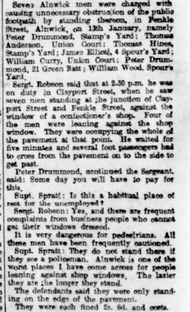 Seven Alnwick men were charged with causing unnecessary obstruction of the public footpath by standing thereon, in Fenkle Street, Alnwick, on 13th January, namely Peter Drummomd, Stamp's Yard; Thomas Anderson, Union Court; Thomas Hines, Stamp's Yard ; James Elliot, 4 Spour’s Yard ; William Curry, Union Court; Peter Drummond, 21 Green Batt ; William Wood, Spoars Yard. Sergt. Robson said that at 2:30 p.m. he was on duty in Clayport Street, when he saw seven men standing at the junction of Clayport Street and Fenkle Street, against the window of a confectioner’s shop. Four of the men were leaning against the shop window. They were occupying the whole of the pavement at that point. He waited for five minutes and several foot passengers had to cross from the pavement on to the side to get past. Peter Drummond, continued the Sergeant, said: Some day you will have io pay for this Supt. Spratt: Is this a habitual place of rest for the unemployed" Sergt. Robson: Yes, and there are frequent complaints from business people who cannot get their windows dressed. It is very dangerous for pedestrians. All these men have been frequently cautioned. Supt. Spratt: They do not stand there if they see a policeman, Alnwick is one of the worst places I have come across for people leaning against shop windows, The lazier they are the longer they stand. The defendants said they were only standing on the edge of the pavement. They were each fined 2s. 6d. and costs.