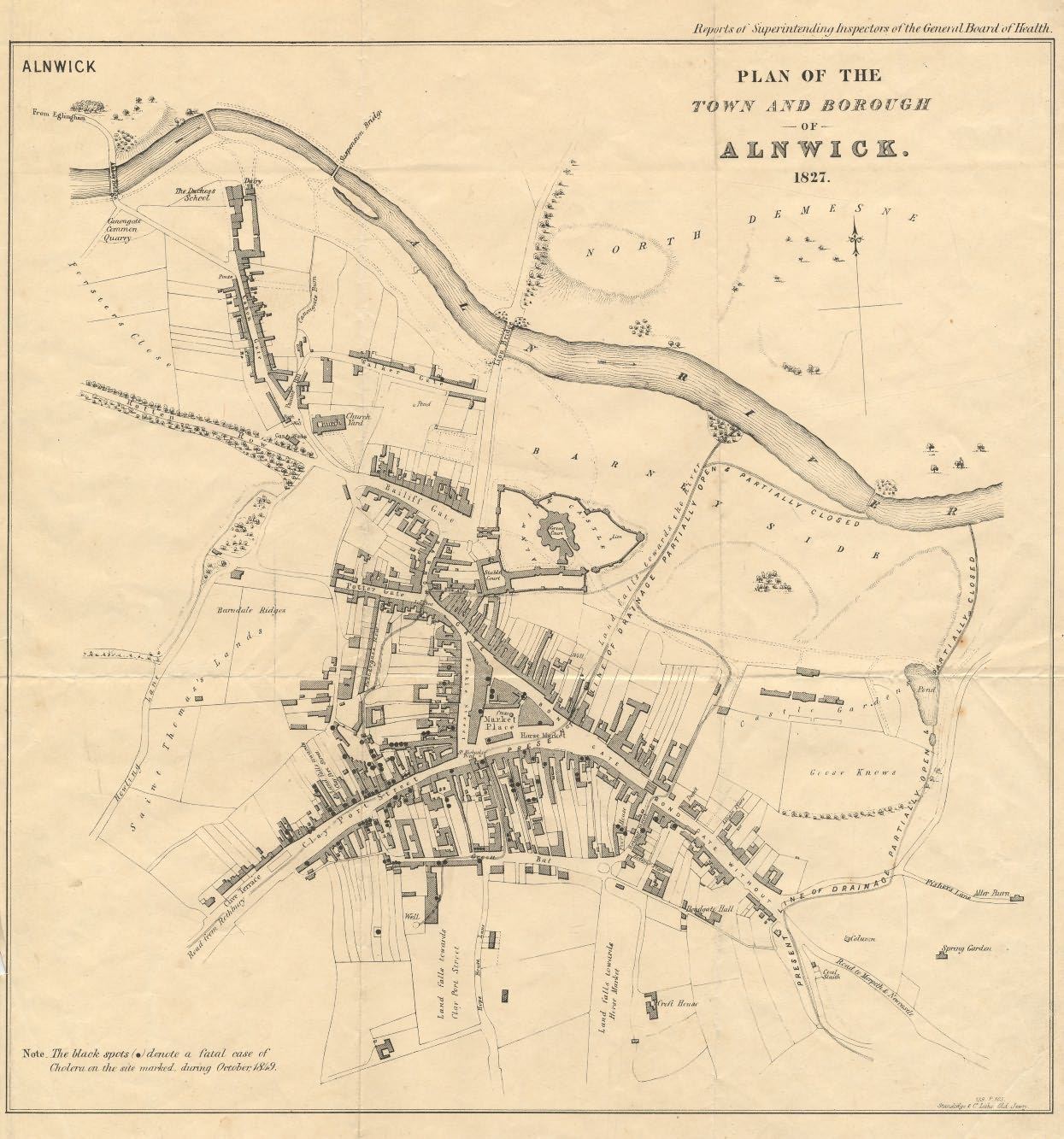 Plan of Alnwick showing the site of fatal cases of cholera during the outbreak in October 1849. The cases are indicated with a black spot on the plan. This item comes from the extensive collection of plans etc. produced by Bell and Sons Surveyors and Land Agent's of Gateshead, County Durham. John Bell [born 11th February 1755 died 12th January 1816] trained as a land surveyor under John Fryer, who produced the 1820 map of Northumberland. John set up his own business in 1794 as a bookseller and surveyor. His two eldest sons took over the business; John Bell [born 7th October 1783 died 31st October 1864] was mostly interested with books, and Thomas Bell [born 16th December 1785 died 39th April 1860] with surveying and land agency. As surveyors and valuers the Bells were often engaged as commissioners or, surveyors on the enclosure of common and wastelands in the late 18th and early 19th centuries. They were also heavily involved in the surveying of the Tithe maps following an Act of Parliament in 1836. These commissions and their other work concerned with the construction of railways and public works and as agents to notable landed families, notably the Duke of Northumberland, gave the Bells an unrivalled knowledge of the land and local history. As a result of their undertakings the Bells built up an extensive collection of material. Thomas Bell was also a keen genealogist and the Reverend John Hodgson extensively used his pedigrees and family histories when he wrote the History of Northumberland in 1828.